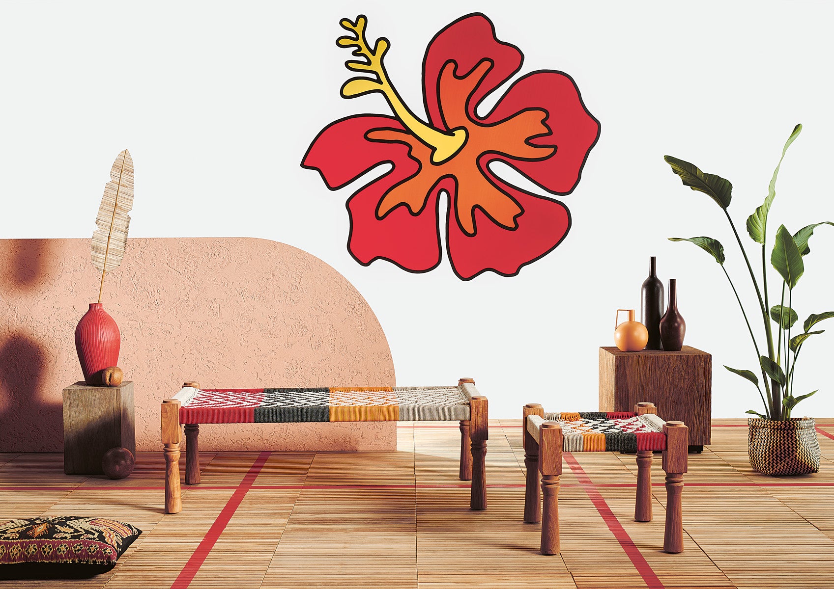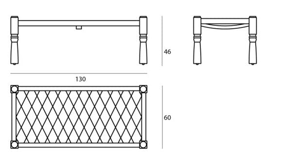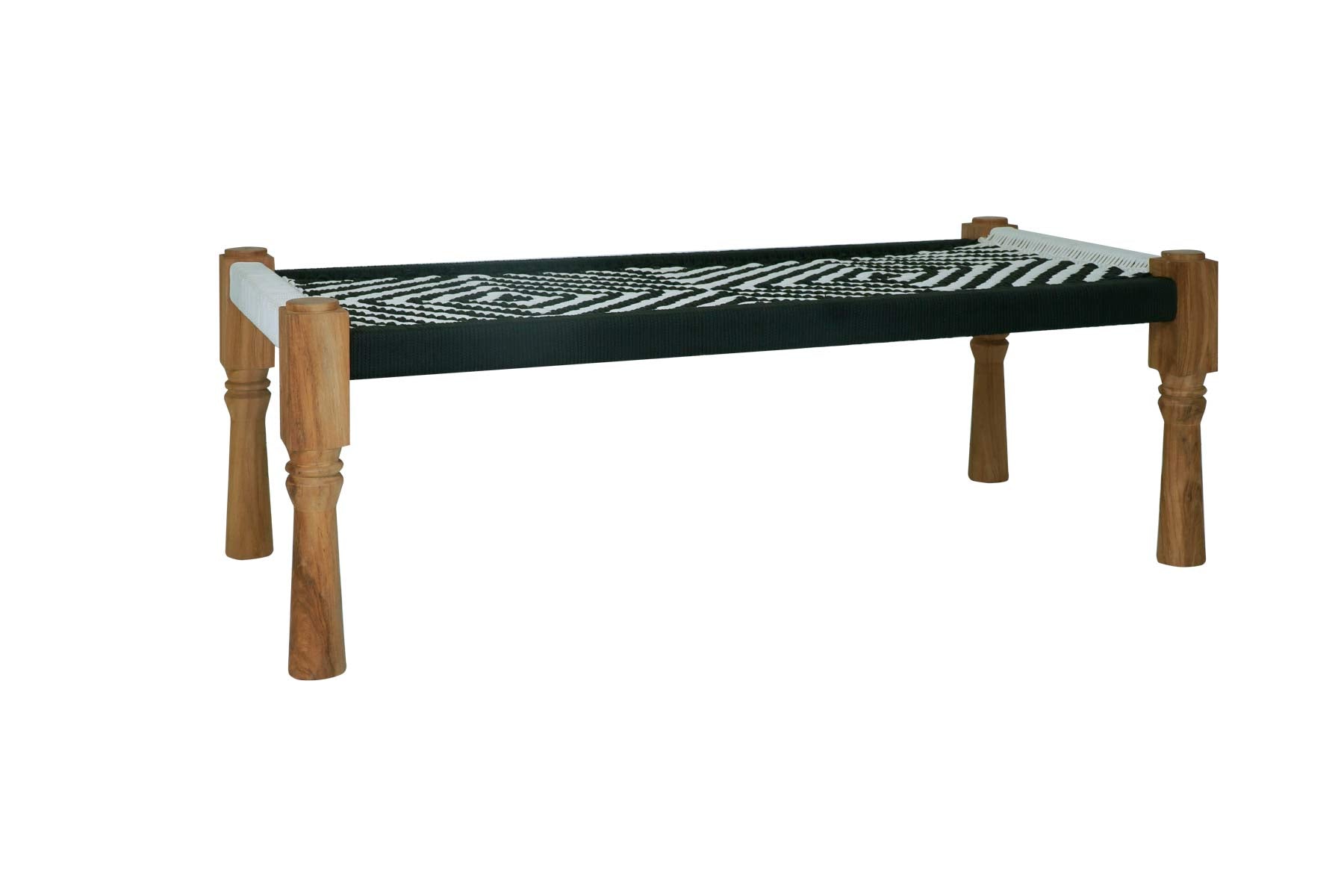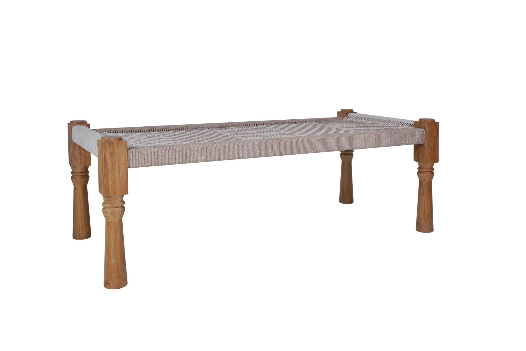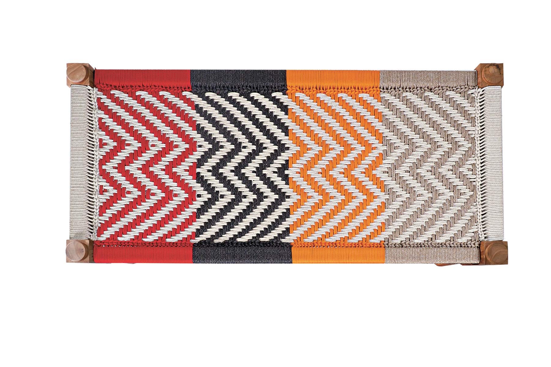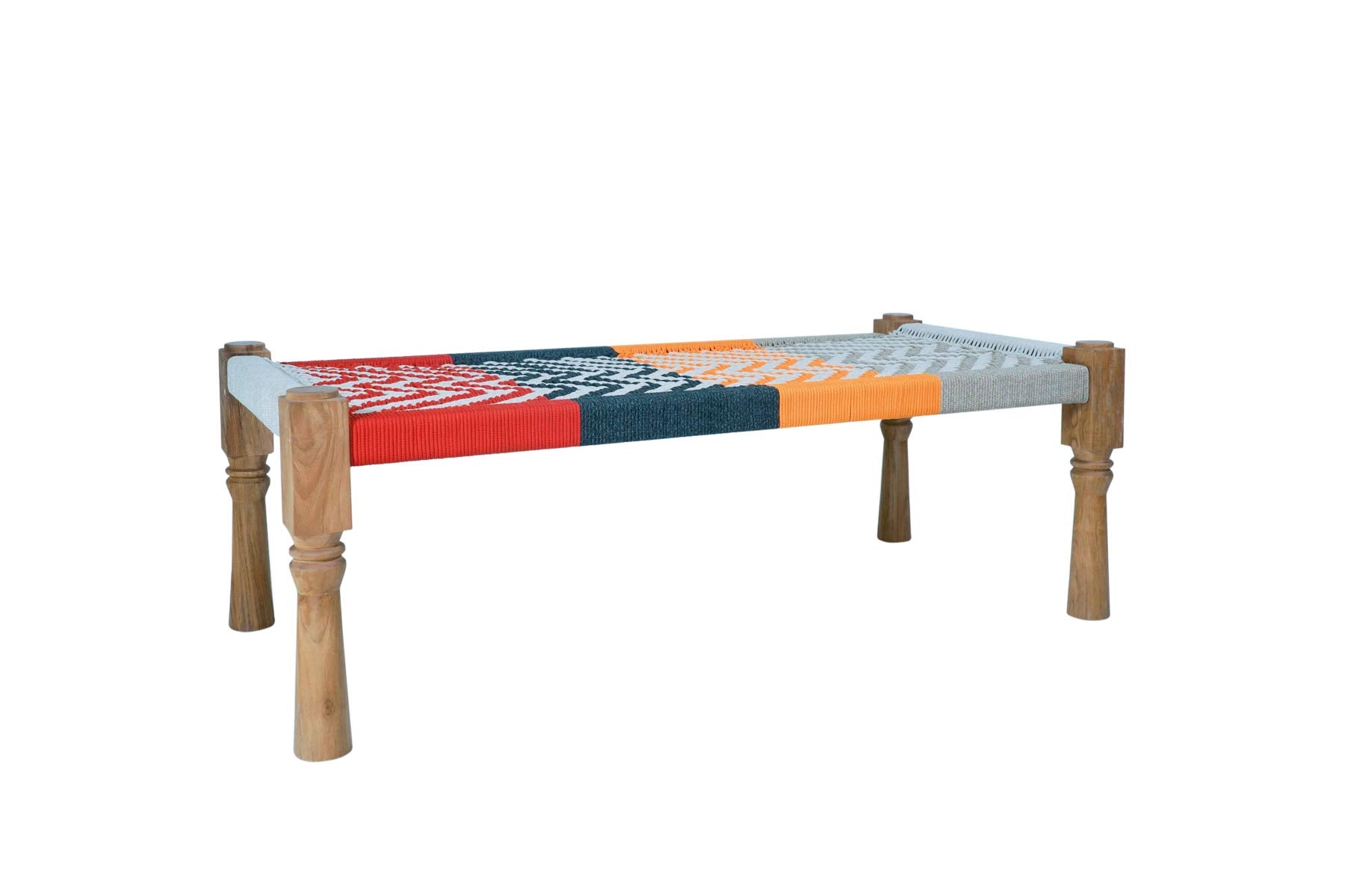 Banco sem encosto da coleção Charpai em madeira de teca e corda outdoor na versão standard. A coleção Charpai é inspirada na tradição oriental, com tons que lembram os coloridos souqs, mercados do centro histórico com pisos onde se alternam em camadas diferentes cores de tapetes feitos à mão e paredes cobertas com recipientes de especiarias aromáticas. O processamento de componentes de madeira é aqui revisto como uma simplificação em formas essenciais que se inspiram em objetos do cotidiano.