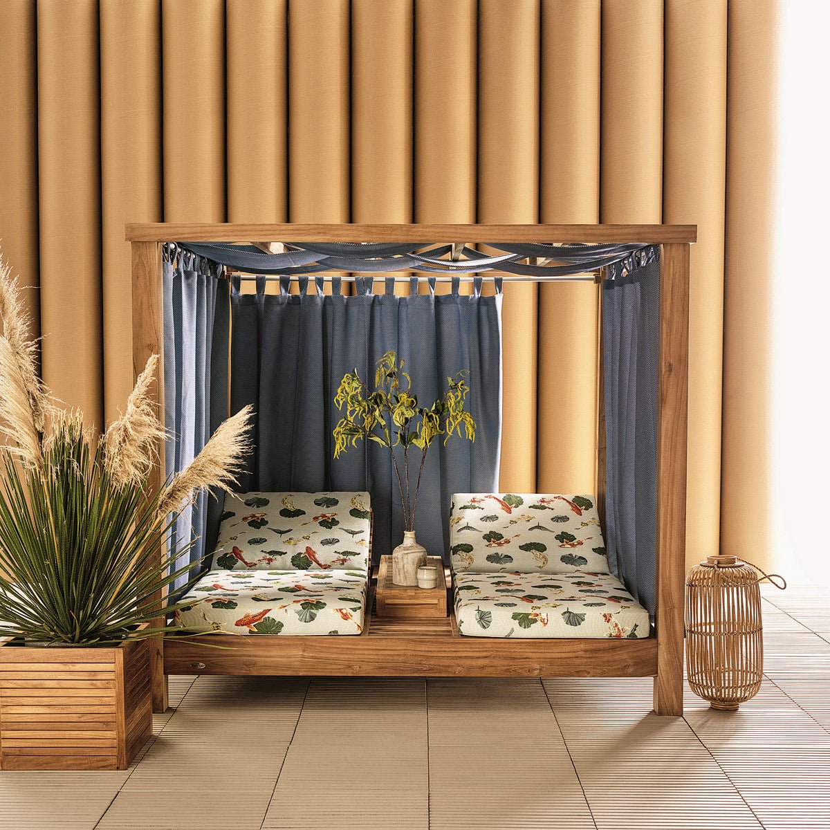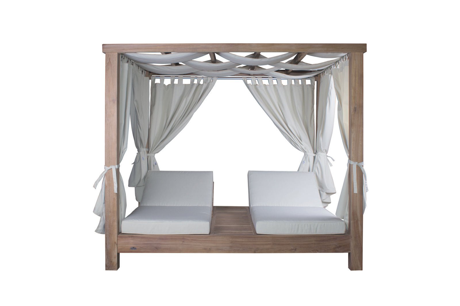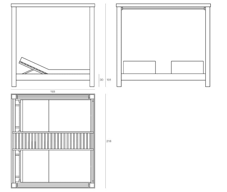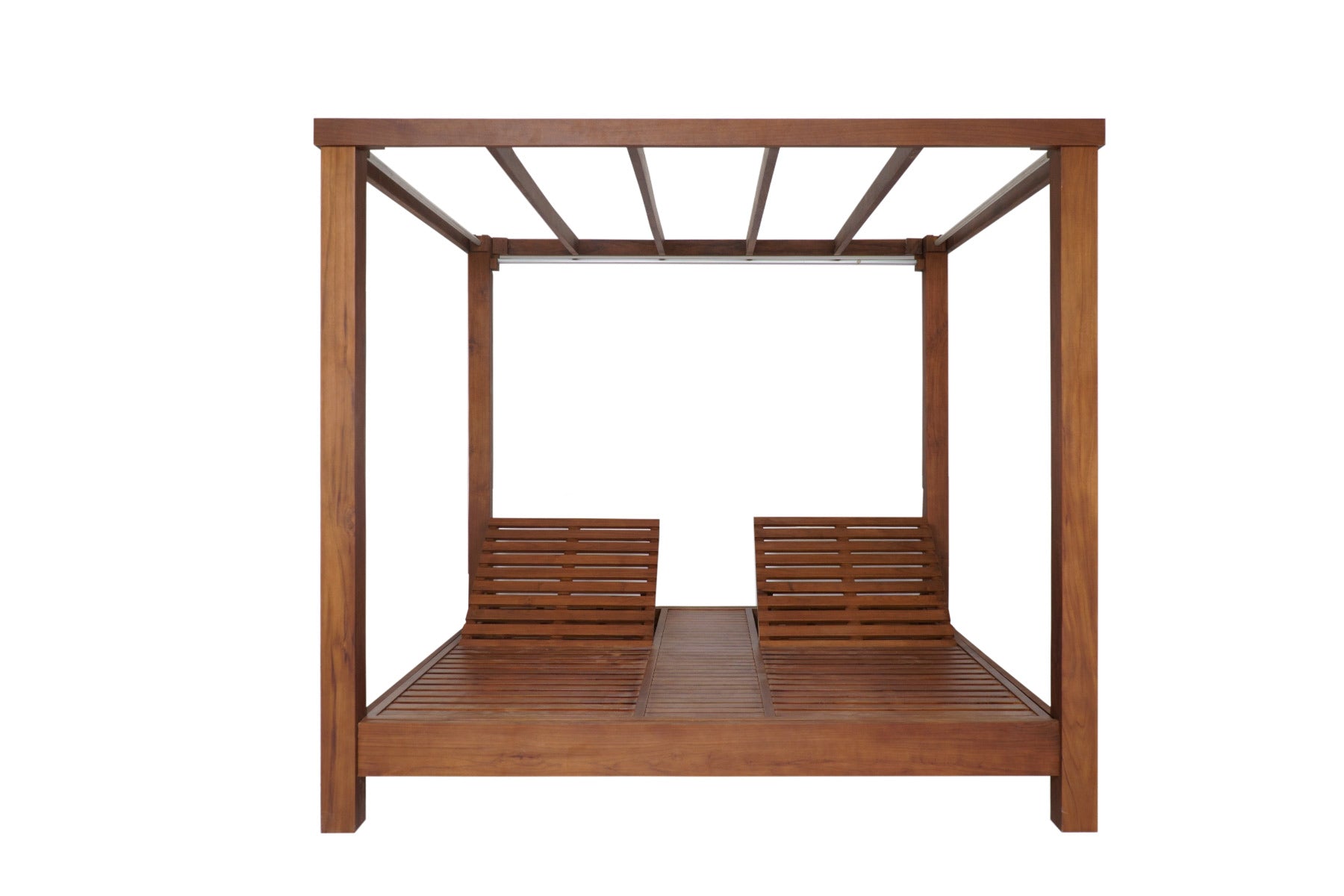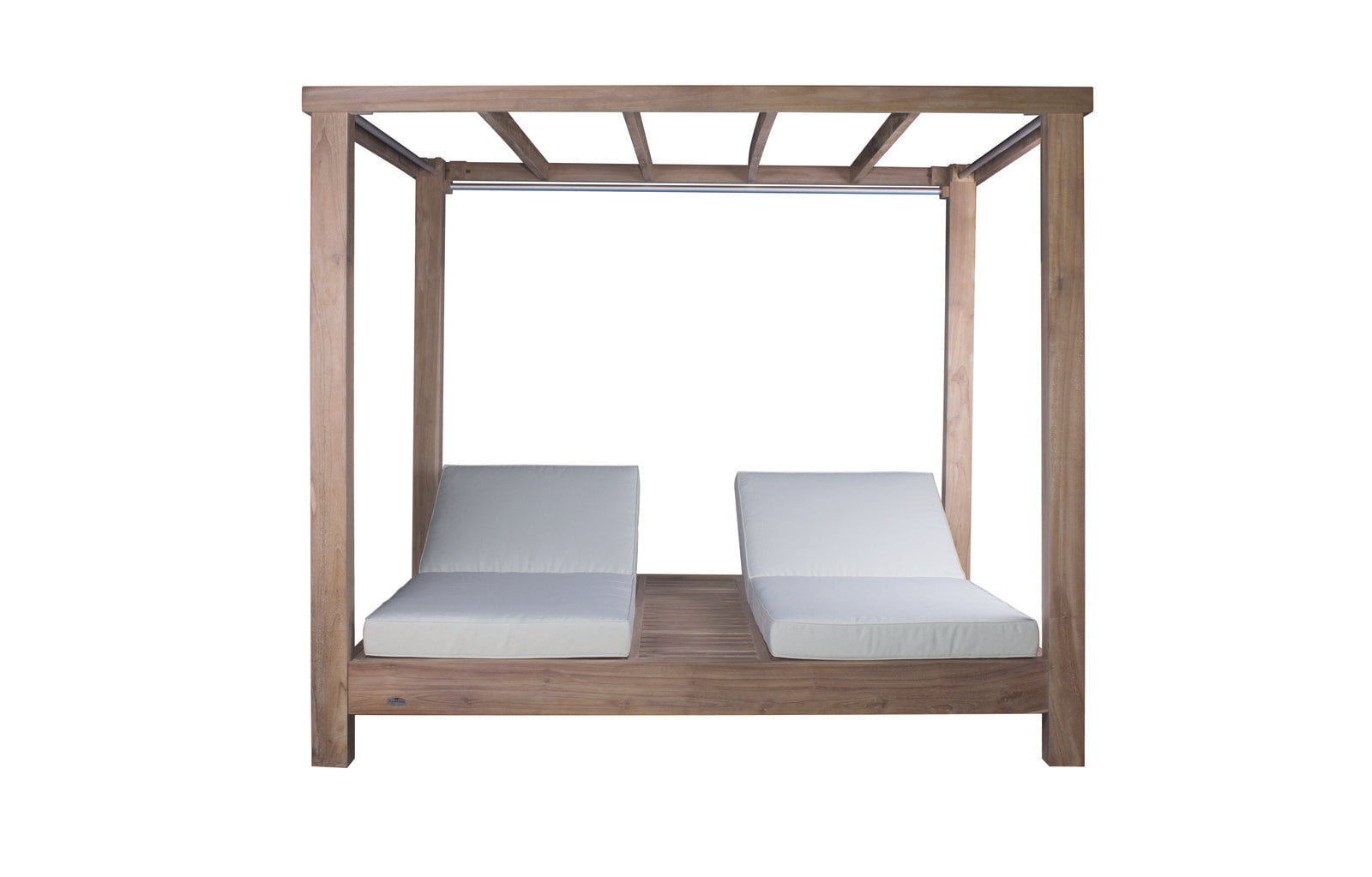Cabana para duas pessoas, com duas espreguiçadeiras perfeitamente independentes mas dispostas sob a mesma cobertura de ripas de teca. Tal como o resto da linha Classica, possui um design essencial mas eficiente e muito elegante.