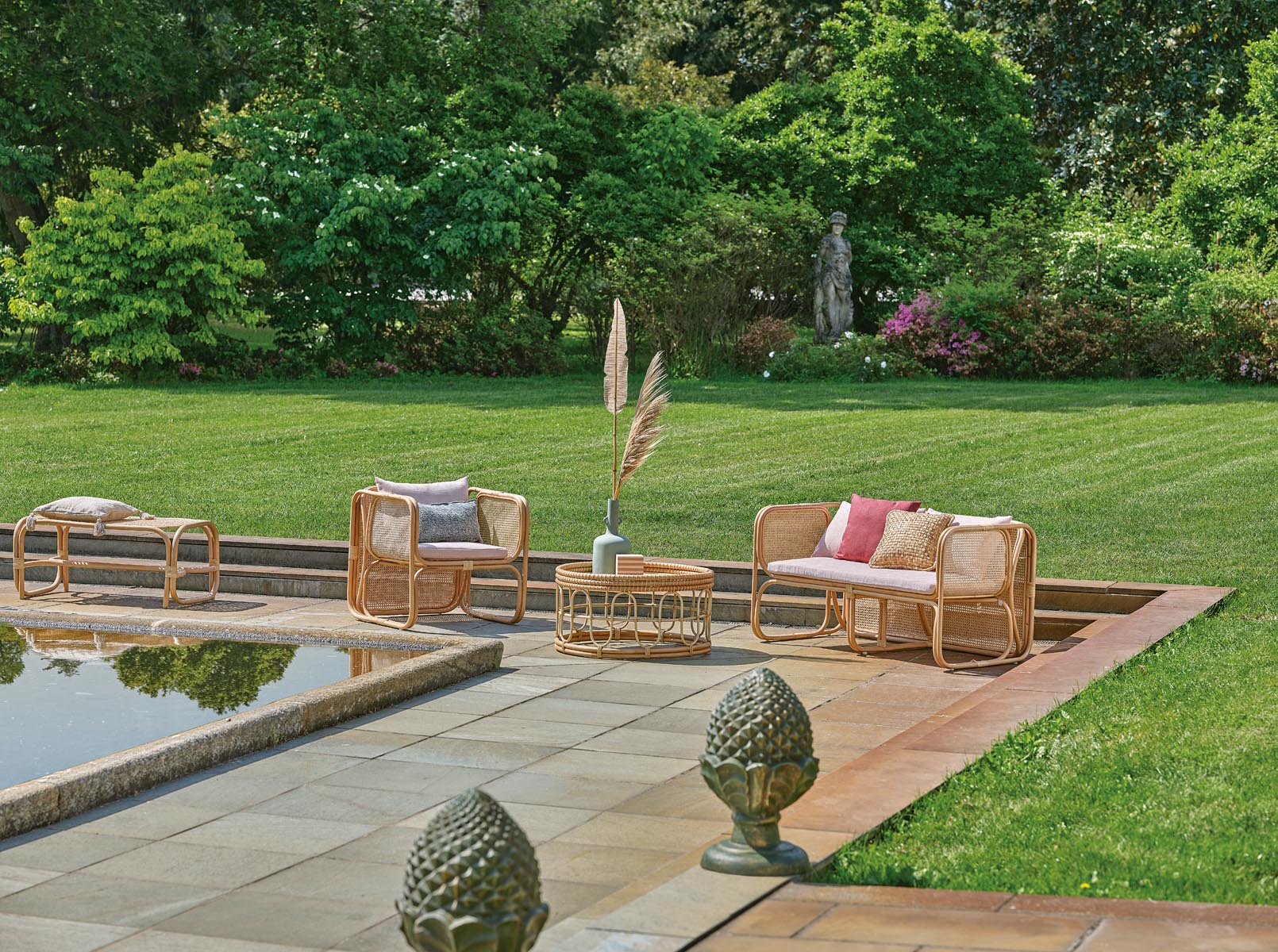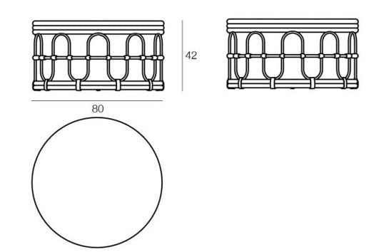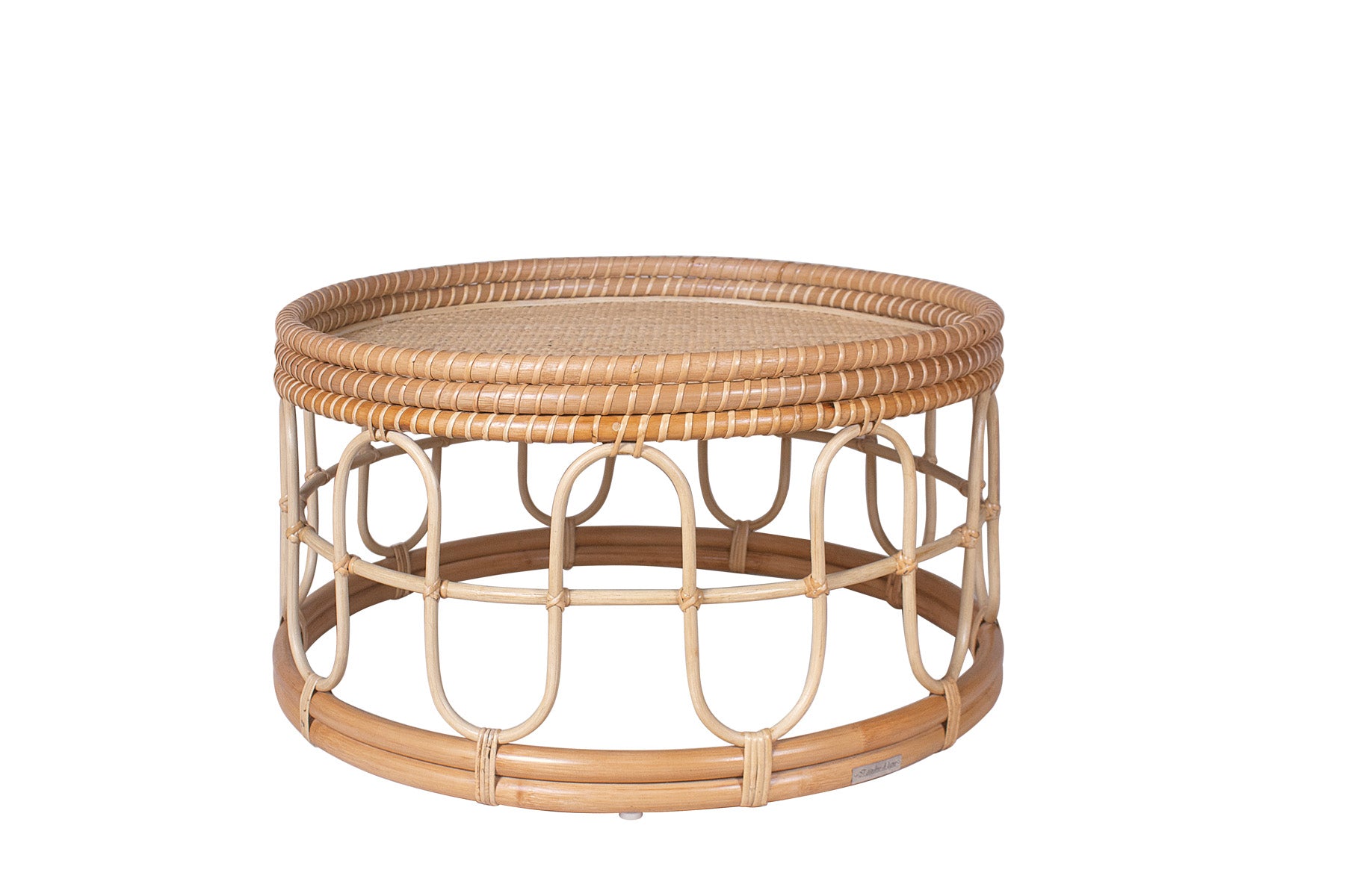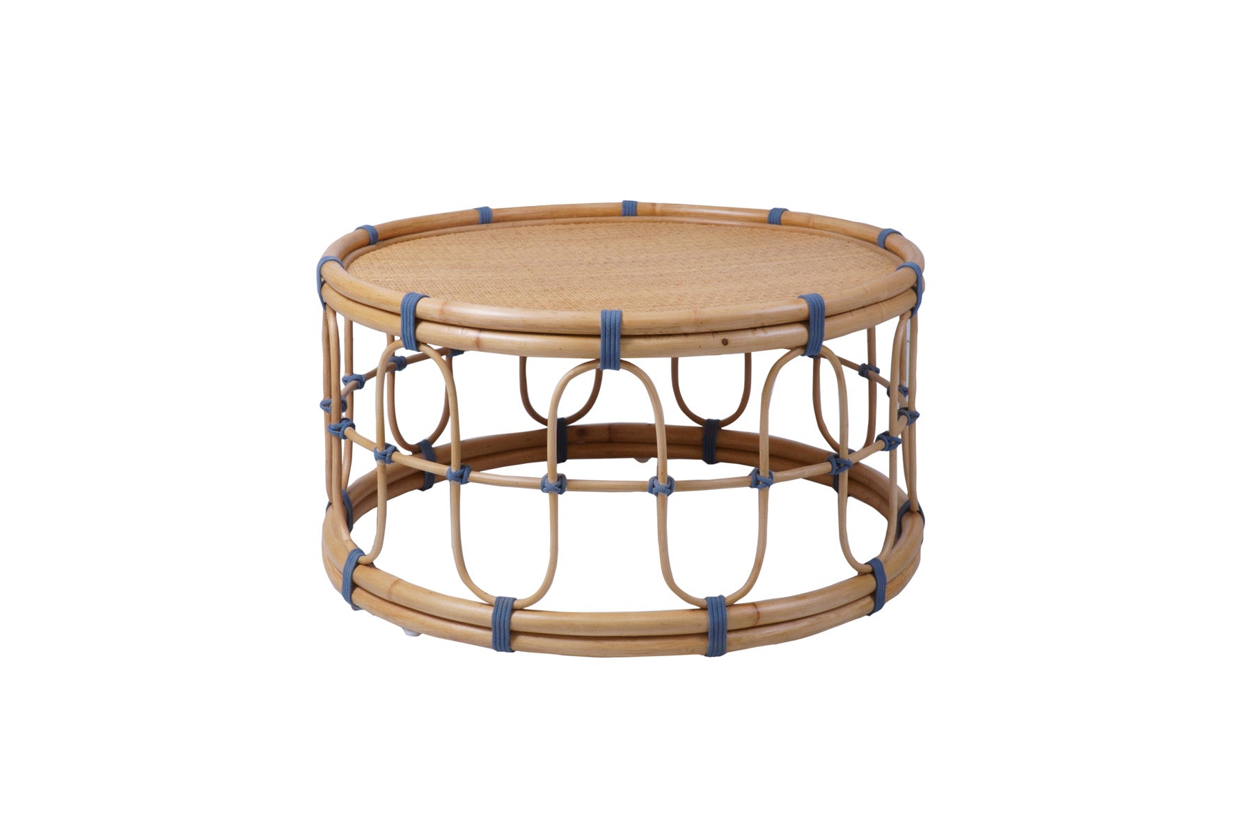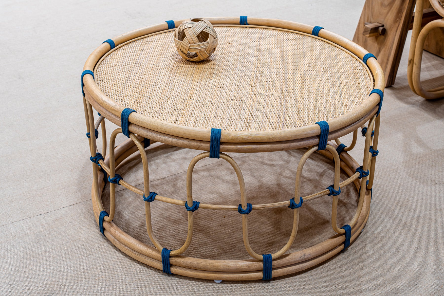 Mesa de centro redonda com decoração sinuosa dada pela união de bambu, rattan e corda.