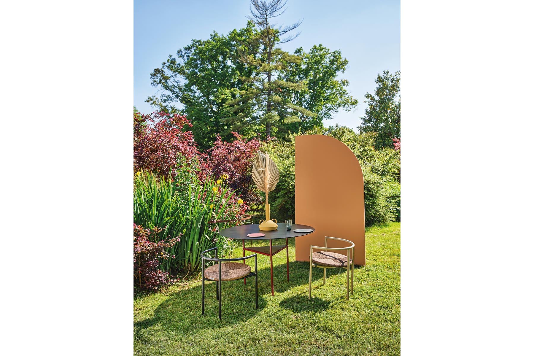 Poltrona de exterior com assento em corda sintética de cor taupe e estrutura metálica tubular com acabamento em preto áspero. Simples e elegante adequado para qualquer espaço exterior.
