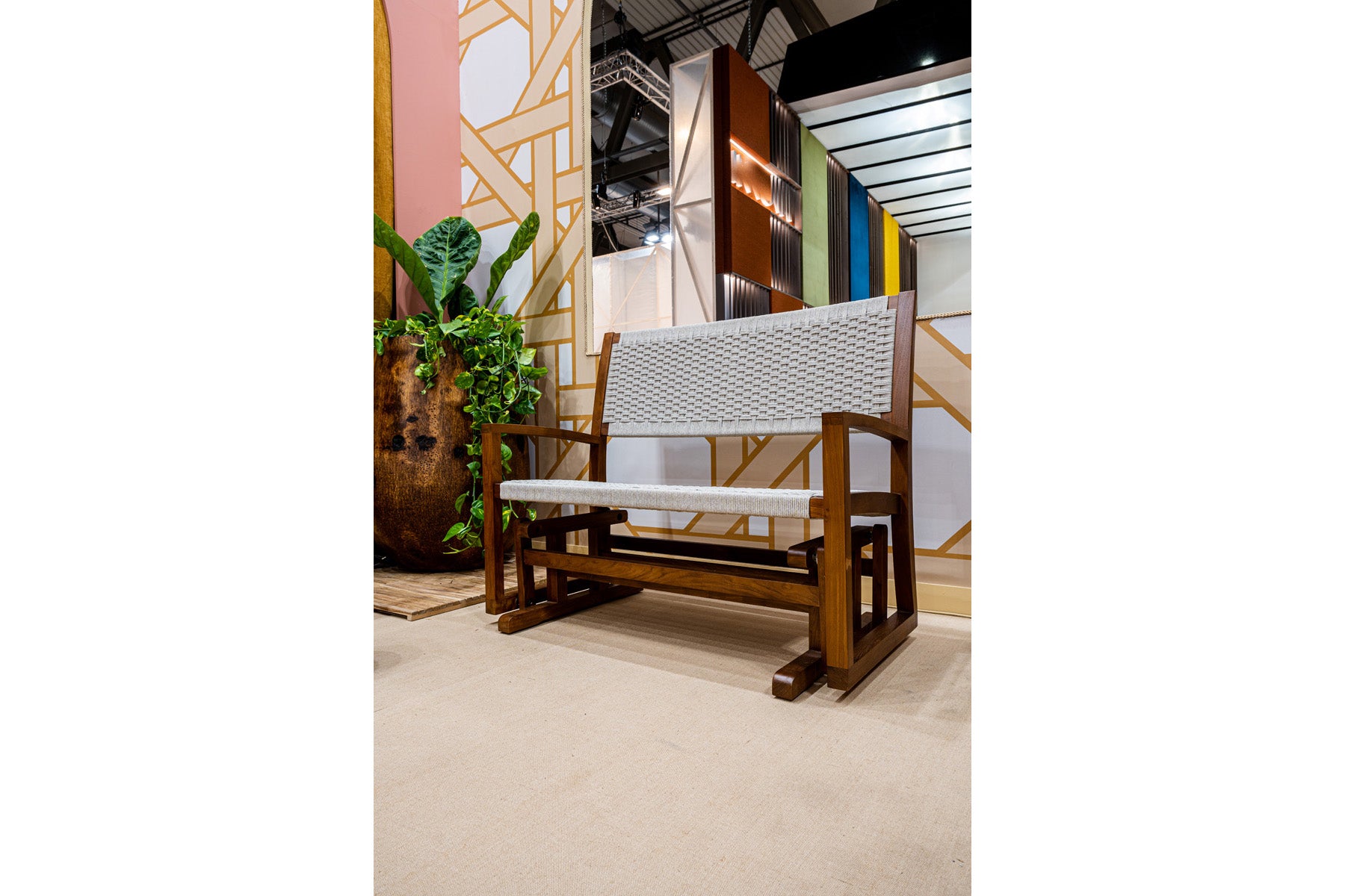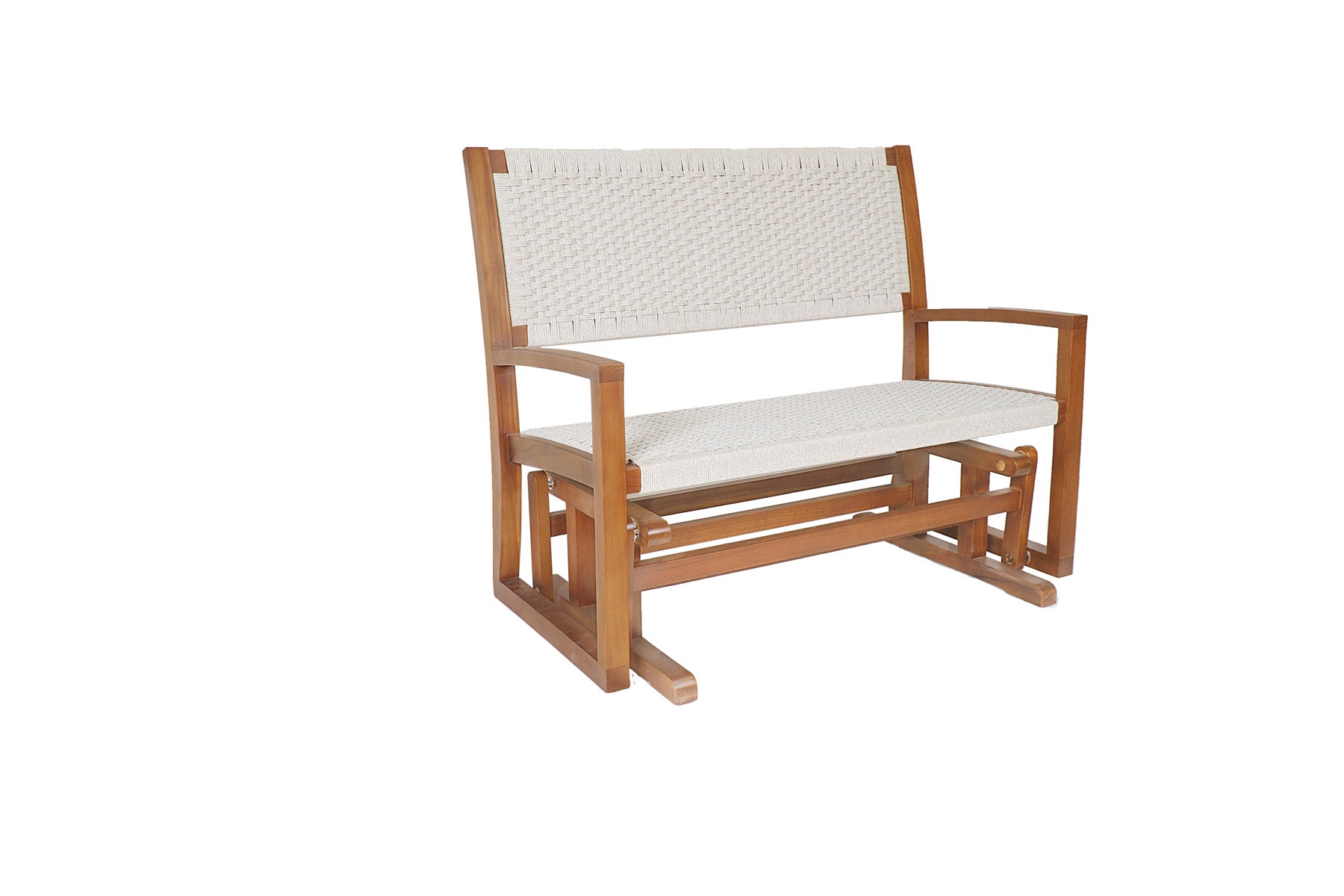 Sofá de balanço com braços e estrutura em teca, assento e encosto em corda na cor cinza. Um sofá adequado para jardins e varandas, perfeito para um momento de relaxamento.